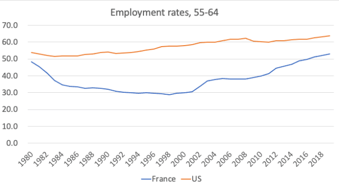 It’s not because incentives don’t matter. Clearly, they do. France’s high taxes haven’t led to low employment of prime-age adults, but generous benefits for those who retire early have led to low employment among near-seniors: