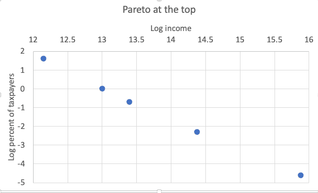 Now, high incomes closely follow a Pareto distribution, indeed to an eerie extent. Here’s a plot of high incomes versus the percentage of taxpayers with incomes above that level, both expressed in natural logs: