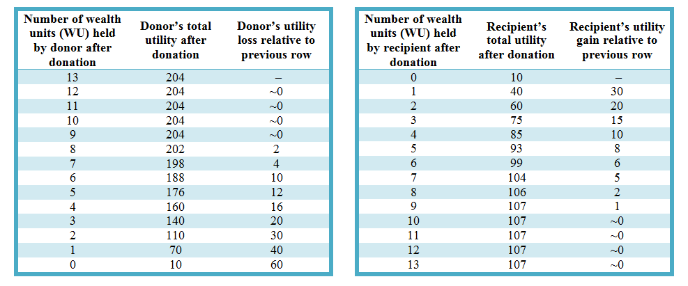 Suppose that ten people get together – nine well-fed Americans and one starving African. Each one has a candy. The well-fed Americans get +1 unit utility from eating a candy, but the starving African gets +10 units utility from eating a candy. The highest utility action is to give all ten candies to the starving African, for a total utility of +100.