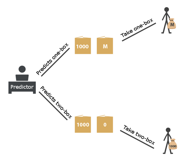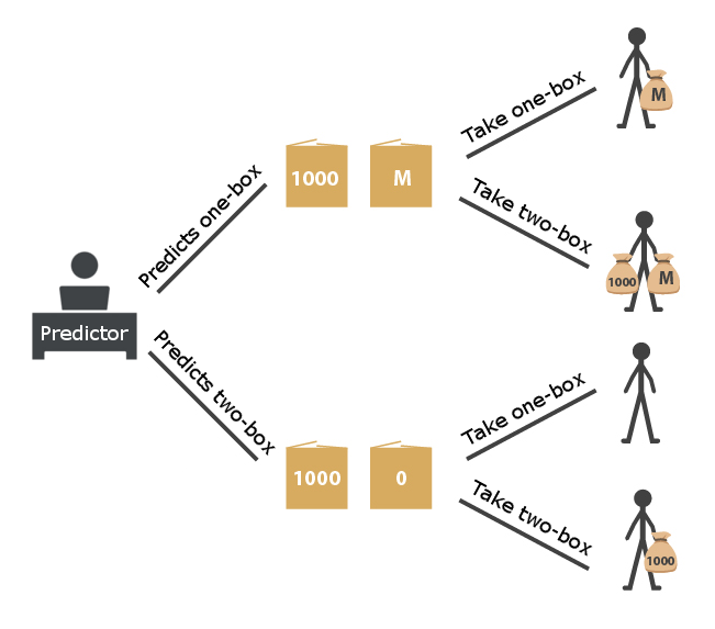 This seems logical enough for a purely mechanical AI, right? Well, the same logic applies to us flesh-and-blood humans too – because after all, at the end of the day, our brains are nothing but biological machines themselves, and the decisions we make are nothing but the product of our neural programming. (See my previous post for more on this.) Whatever choice you might make inside the Predictor’s tent is purely the result of whatever decision-making algorithm is running in your brain at that time; so even though it might feel like you’re freely choosing it in the moment, both your choice and the contents of the boxes are results of what your brain has been pre-programmed to make you do in that situation. Funny enough, that means that even if both boxes were completely transparent and you could actually see that one of them contained $1,000,000, the fact that it did contain that money would necessarily mean that you’d find yourself unable (or more accurately, unwilling) to take both boxes; the fact that the Predictor had perfectly read your programming would mean that there could be no other possible outcome. Seeing the full $1,000,000 box wouldn’t prompt you to also take the $1000 box, because the only way you could have gotten to that point would be if you were the kind of person whose brain was programmed to disregard that temptation. Seeing both boxes full would simply alert you to the fact that your brain was already in the process of deciding to one-box (even if you weren’t consciously aware of it yet). Again, there’s no timeline-branch in which it could be true both that the $1,000,000 box was full and that you would walk away with the $1000, any more than such a thing would be possible if you were a pre-programmed AI. Getting the $1,000,000 is the best outcome that it’s possible for you to achieve; so that’s the outcome that you should be precommitted to bringing about.