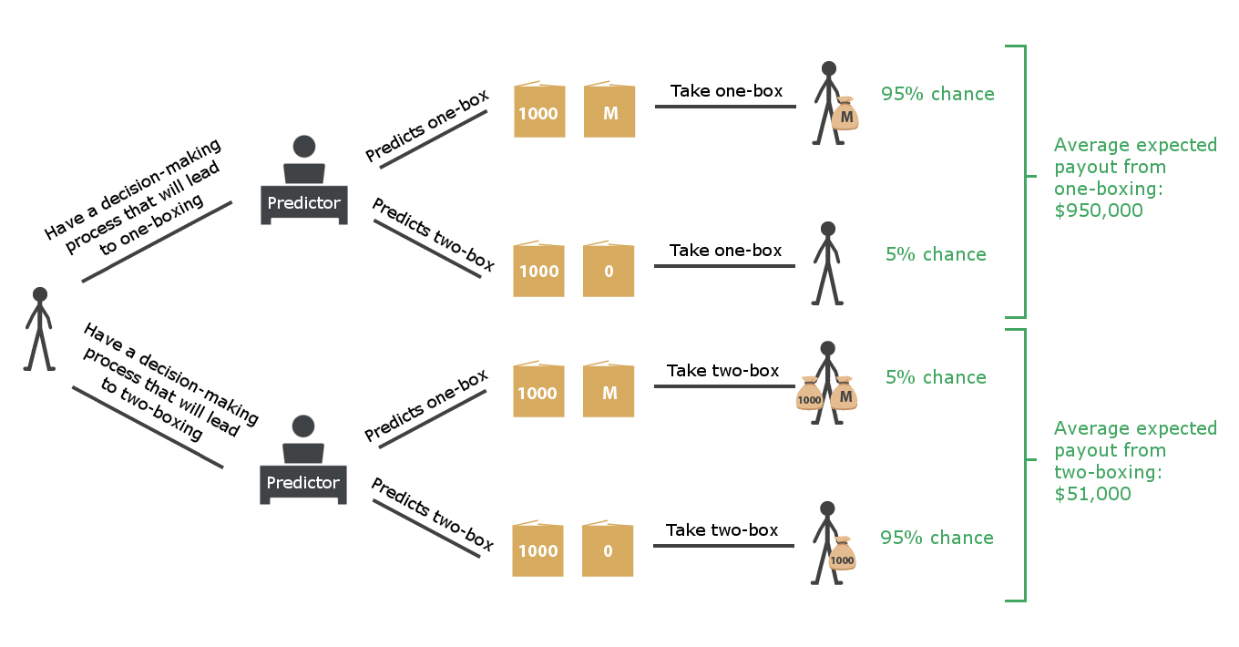 What this means, then, is that once you crunch the numbers, your average expected payout from one-boxing will be $950,000, whereas your average expected payout from two-boxing will be $51,000. Clearly, with an error rate of only 5%, your best decision-making algorithm will still be to precommit to one-boxing, for all the same reasons discussed above.
