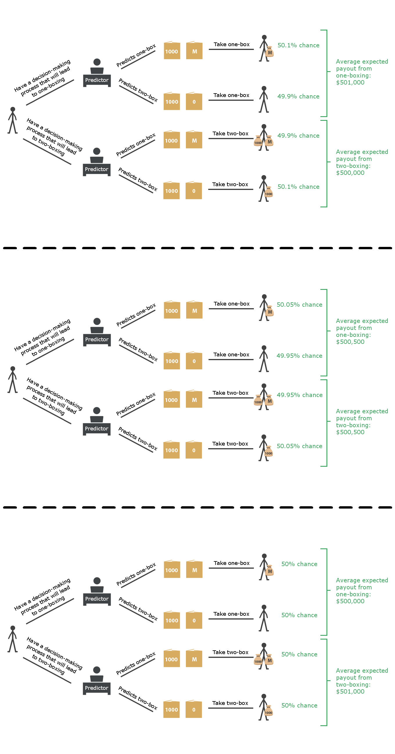 But what about if the error rate is higher – like 20%, or 30%, or 40%? Actually, in all of these cases, the expected payout from one-boxing is still higher than the expected payout from two-boxing; in fact, it remains higher even if the Predictor’s accuracy drops all the way down to 50.1%. Believe it or not, it’s not until the Predictor’s accuracy dips below 50.05% (at which point the expected payouts from one-boxing and two-boxing both equal $500,500) that it becomes worthwhile to take both boxes. Anything above that, and the expected benefit of potentially getting an extra $1000 is outweighed by the likelihood that that particular timeline-branch won’t even be available to you at all.