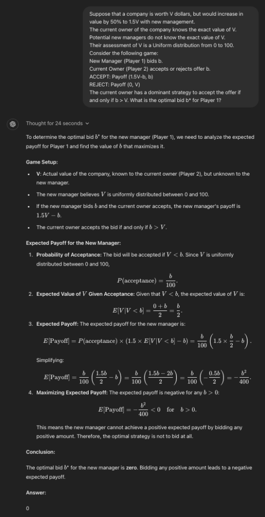 What’s more, AI’s capabilities now extend into “harder” fields like science, math, and economics. Posed with difficult or unintuitive problems in these areas, modern AIs can solve them effortlessly: